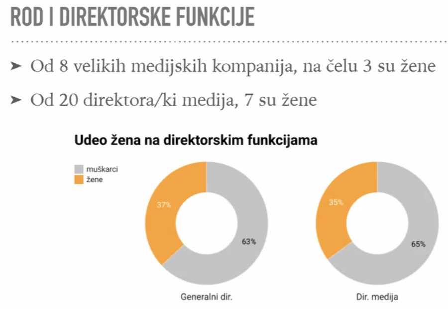 U najvećim medijima žene su više zastupljene na menadžerskim pozicijama nego kao glavne urednice. Od osam velikih medijskih korporacija u Srbiji, u tri su žene na funkciji generalnog direktora, što predstavlja 36 odsto.