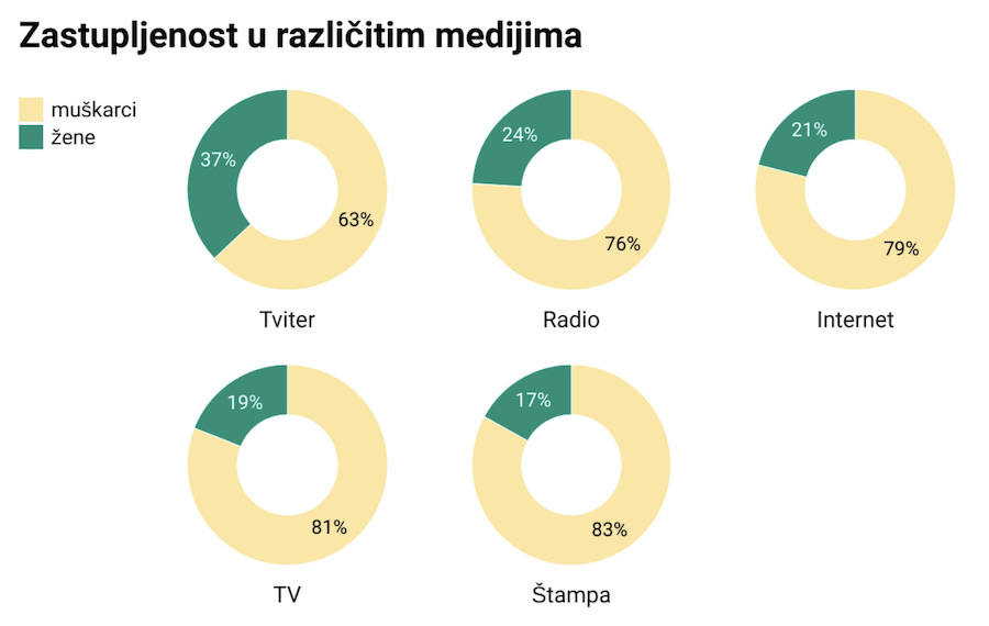 „Ovaj podatak pokazuje da tokom 15 godina od prvog ovakvog istraživanja sprovedenog u Srbiji (1995. godine, prim. nov.), kada je zastupljenost žena bila 21 odsto, nije bilo progresa. Postoji razlika u vidljivosti žena među različitim tipovima medija, tako da u tradicionalnim medijima (štampa, radio, TV) žene čine 19 odsto od svih subjekata i izvora u vestima, dok u onlajn vestima (sajtovi i Tviter) čine četvrtinu“, navodi se u istraživanju.