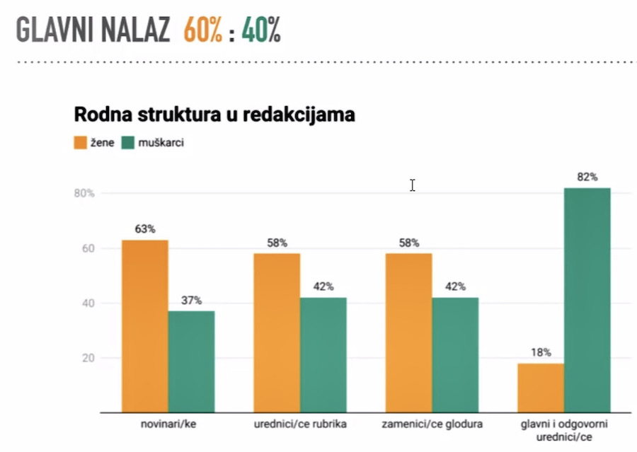 „Novinarke su brojnije od svojih muških kolega“, navodi se u istraživanju. „One čine 63 odsto, a novinari 37 odsto zaposlenih. Kao urednice rubrika takođe su većina (58%), i ta razmera se održava i kada je reč o mestu pomoćnika/pomoćnice i zamenika/zamenice glavnih i odgovornih urednika/urednica. Međutim, tu dolazi do radikalne promene, na najuglednijem i najprominentnijem mestu za novinarsku profesiju – mestu glavnog i odgovornog urednika – samo je 18 odsto žena (6 od 34).“