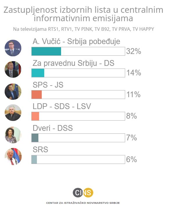 Službe REM-a su utvrdile da je u periodu od 4. marta do 21. aprila izborna lista čiji je nosilac bio Aleksandar Vučić u centralnim informativnim emisijama (dnevnicima i vestima u udarnim terminima) bila zastupljena šest sati i 25 minuta, odnosno skoro trećinu ukupnog vremena koje su kandidati imali, dok je opoziciona DS dobila dva sata i 46 minuta.