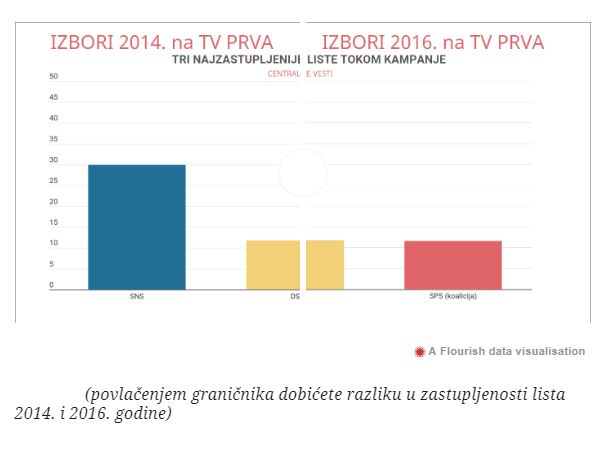 Kada se uporede izveštaji iz 2014. i 2016, primećuje se da su televizije povećale prostor za promociju vladajuće SNS. Vreme koje je SNS ukupno dobio 2016. u centralnim informativnim emisijama je dva sata više u odnosu na 2014. godinu kada je SNS lista bila prisutna oko četiri i po sata, odnosno 19,6% vremena, a DS 12%.