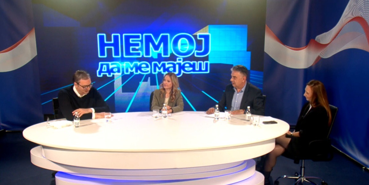 Prva emisija na Niš TV sa Vučićem i Gordanom Uzelac; Bojan Avramović je treći sleva; Foto: YT Screenshot Niš TV