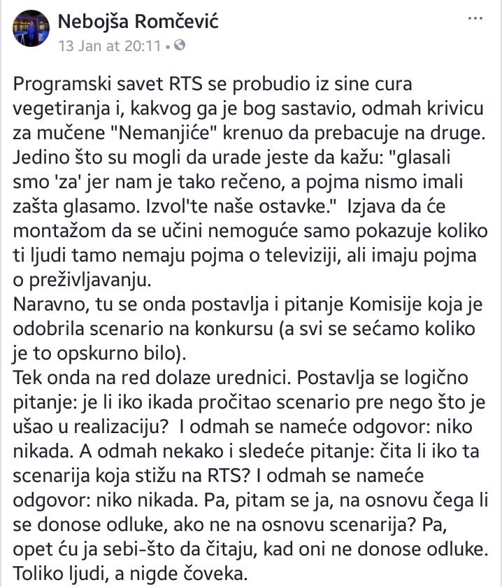 Nedavno se oglasio i dramski pisac Nebojša Romčević, koji je na svom Fejsbuk profilu uputio kritiku pre svega na račun RTS-a: