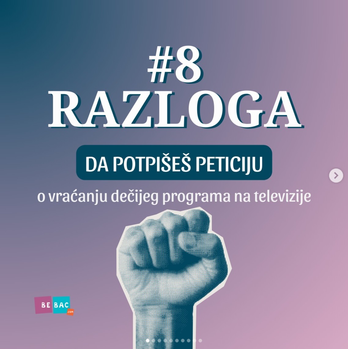 „Mi moramo da pokušamo da promenimo ovo društvo. Peticija je način da skupimo određene ljude koji slično razmišljaju i da pokušamo da fokus javnosti okrenemo na ono što je važno. Mi moramo govoriti o važnim temama i svakako ćemo našu peticiju sa svim potpisnicima poslati državnim organima, skupštinskim odborima za kulturui informisanje, odborima za prava deteta, zdravlje i porodicu kako bismo načinili da se nešto promeni. Nešto mora da se promeni. Ovog puta želim da pozovem sve da potpišu peticiju za vraćanje dečjeg programa televizije jer zaista kultura rađa kulturu, nasilja rađa nasilje, a naša deca i naše društvo zaslužuju promenu ka boljem“, zaključila je ona.