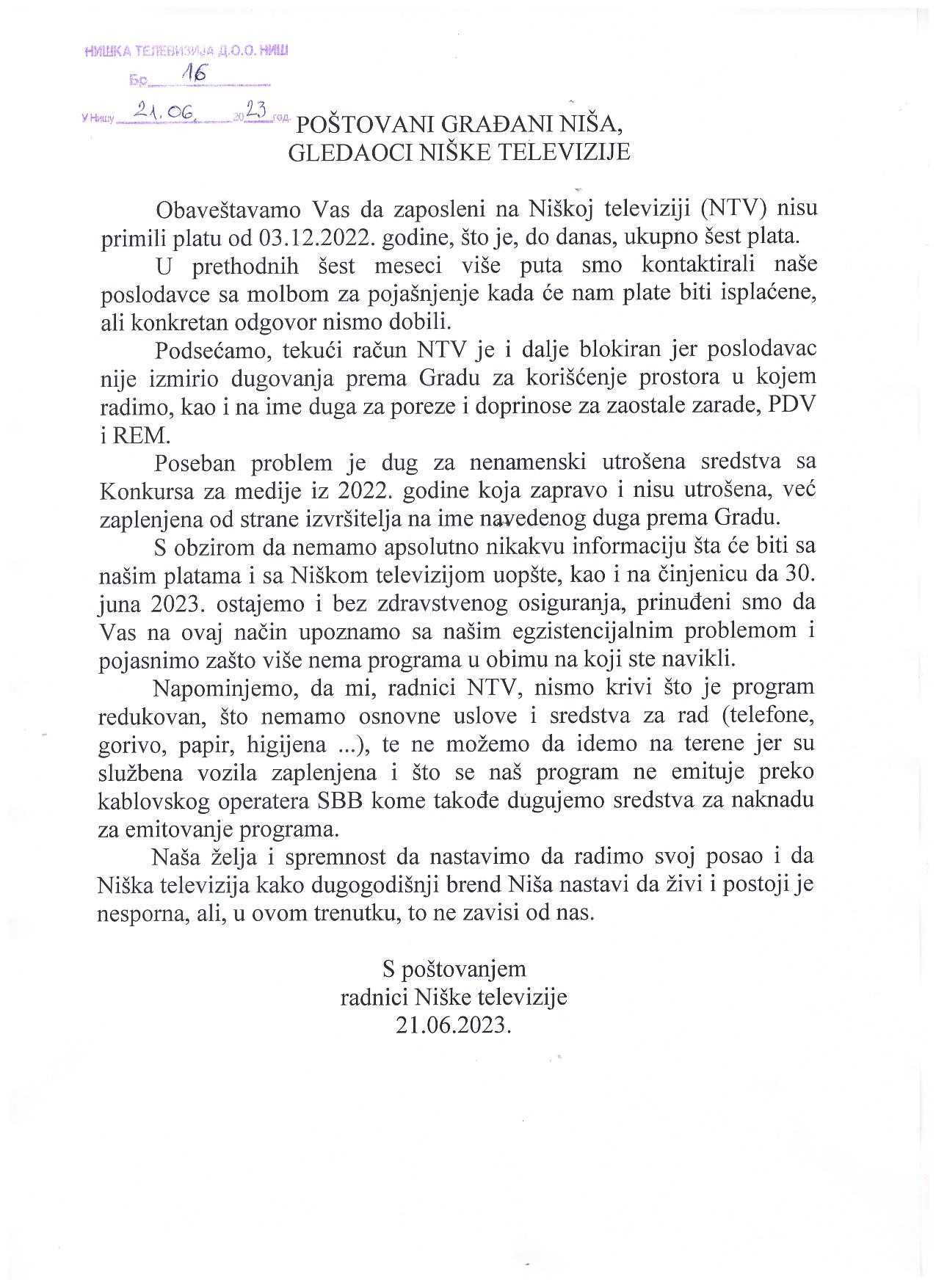 Oni su ocenili da je radnicima Niške televizije potrebna hitna podrška kako bi očuvali svoje dostojanstvo i osnovna radna prava.