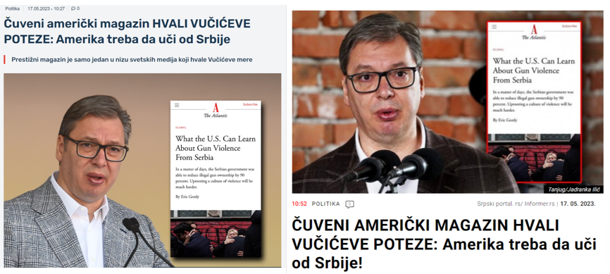 Nekoliko portala u Srbiji je danas objavilo da američki magazin The Atlantic hvali Vučića i njegove mere koje se tiču razoružavanja, nakon dva masovna ubistva u Srbiji.