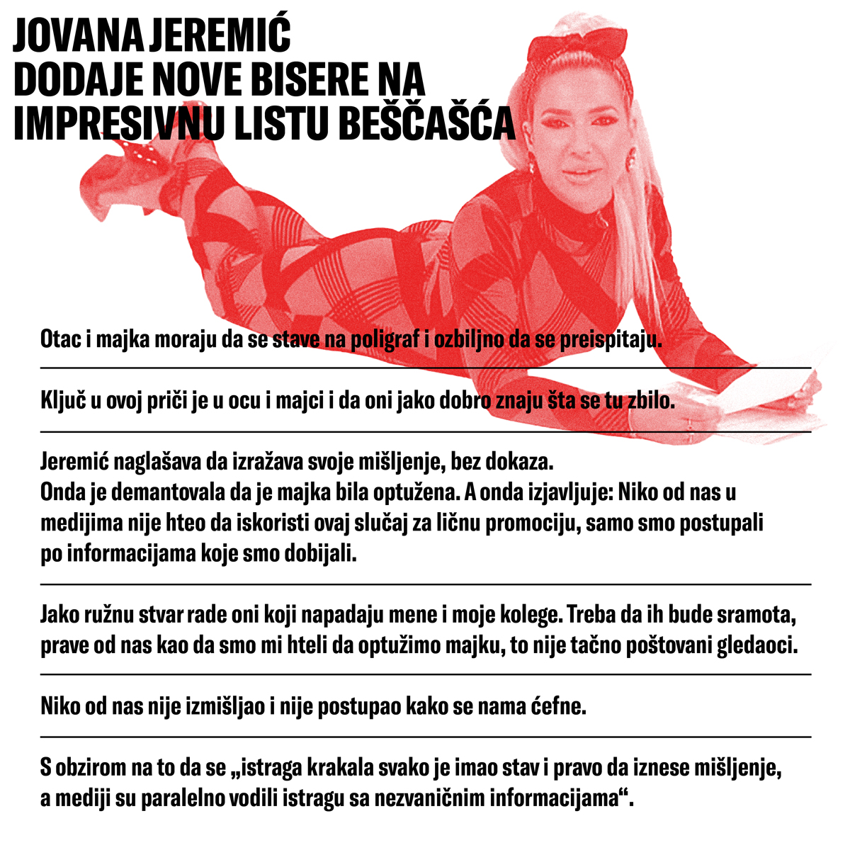 „Niko od nas u medijima nije hteo da iskoristi ovaj slučaj za ličnu promociju, samo smo postupali po informacijama koje smo dobijali, a propo ovog što rade neki na Tviteru, jako ružnu stvar, napadaju mene i moje kolege. Treba da ih bude sramota i prave od nas kao da smo mi hteli da optužimo majku, to nije tačno, poštovani gledaoci. Niko od nas nije izmišljao i nije postupao kako se nama ćefne“, tvrdila je Jeremić.