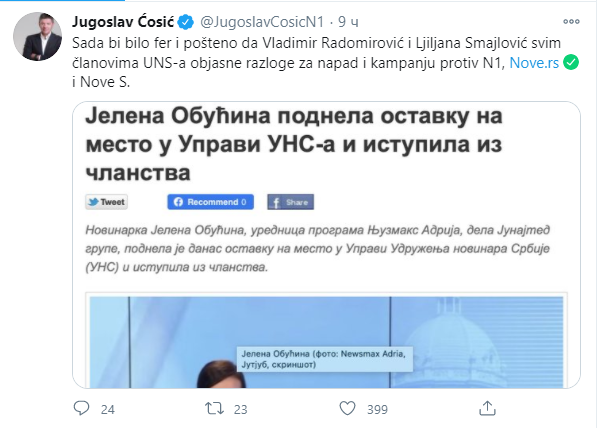Programski direktor televizije N1 Jugoslav Ćosić na Tviteru je komentarisao to što je Jelena Obućina podnela ostavku na mesto u Upravi UNS-a i istupila iz članstva. „Sad bi bilo fer i pošteno da Vladimir Radomirović i Ljiljana Smajlović svim članovima UNS-a objasne razloge za napad i kampanju protiv N1“, napisao je Ćosić.