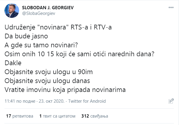 – Udruženje „novinara“ RTS-a i RTV-a Da bude jasno A gde su tamo novinari? Osim onih 10 15 koji će sami otići narednih dana? Dakle Objasnite svoju ulogu u 90im Objasnite svoju ulogu danas Vratite imovinu koja pripada novinarima, napisao je u tvitu Georgiev.