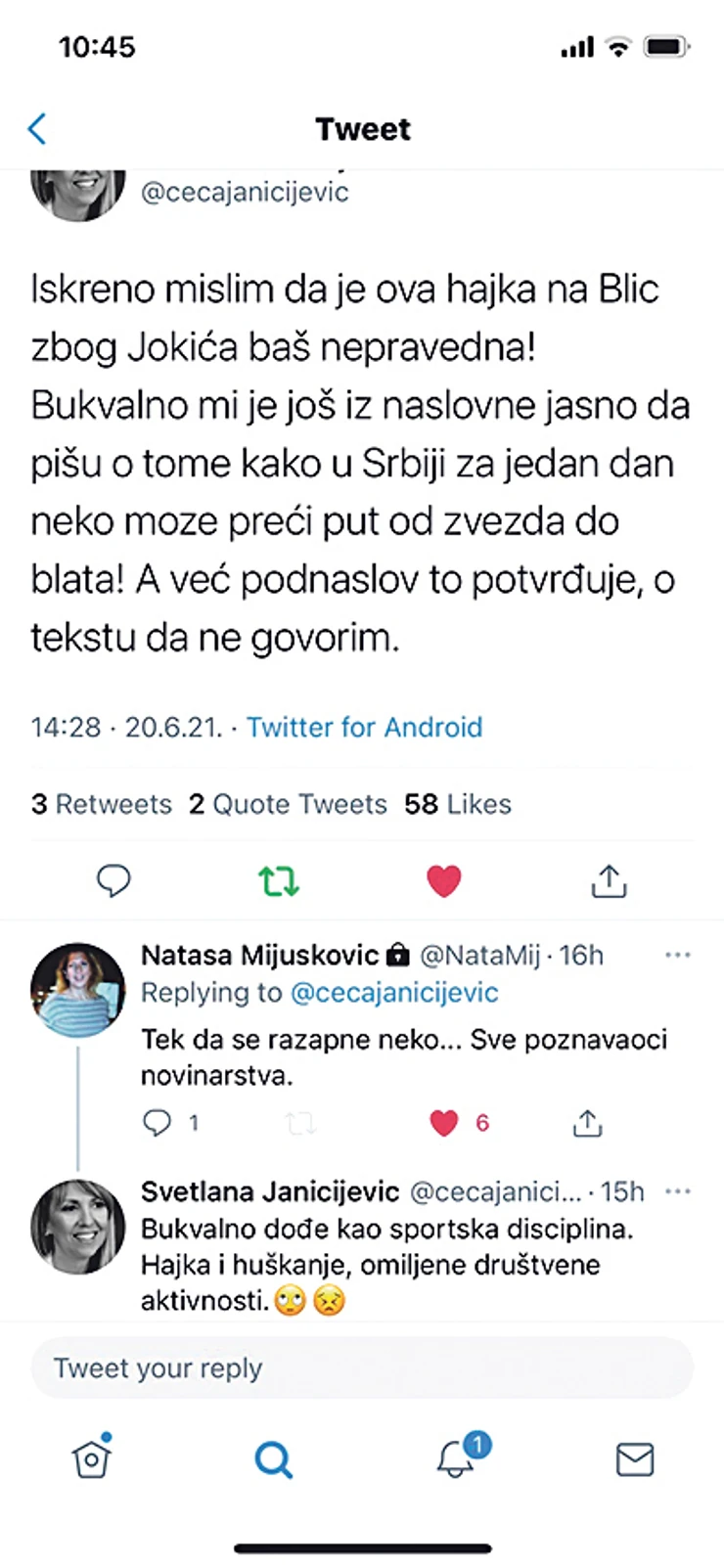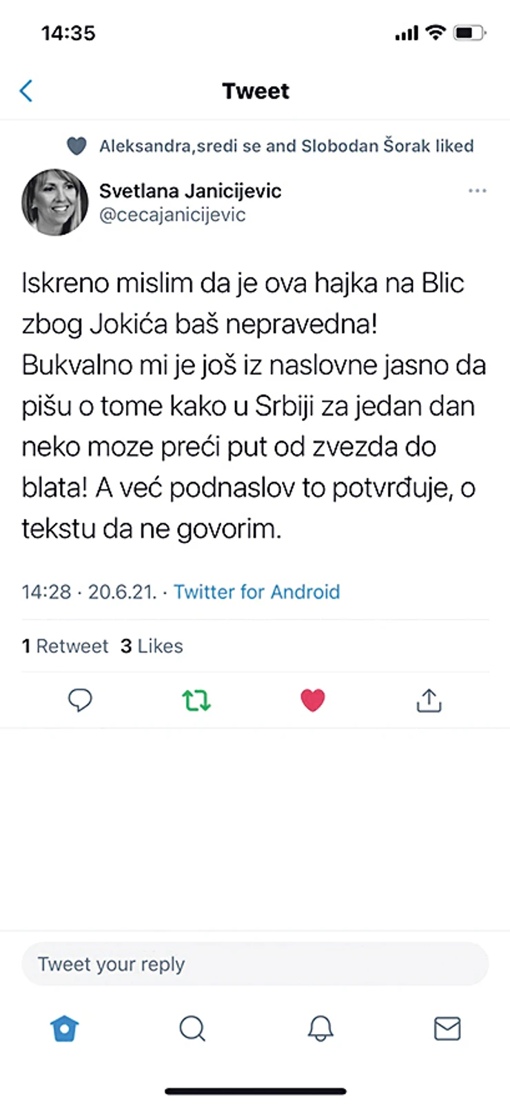 Pravnik iz Beograda Milan Antonijević objavio je u nedelju tvit sledeće sadržine: „Da li ste vi pri čistoj svesti u Blicu? Kakav izdajnik srpskog roda? Da li bi trebalo Nikola Jokić da vam plati da ga ne proganjate po naslovnim stranama ili u čemu je problem?“.