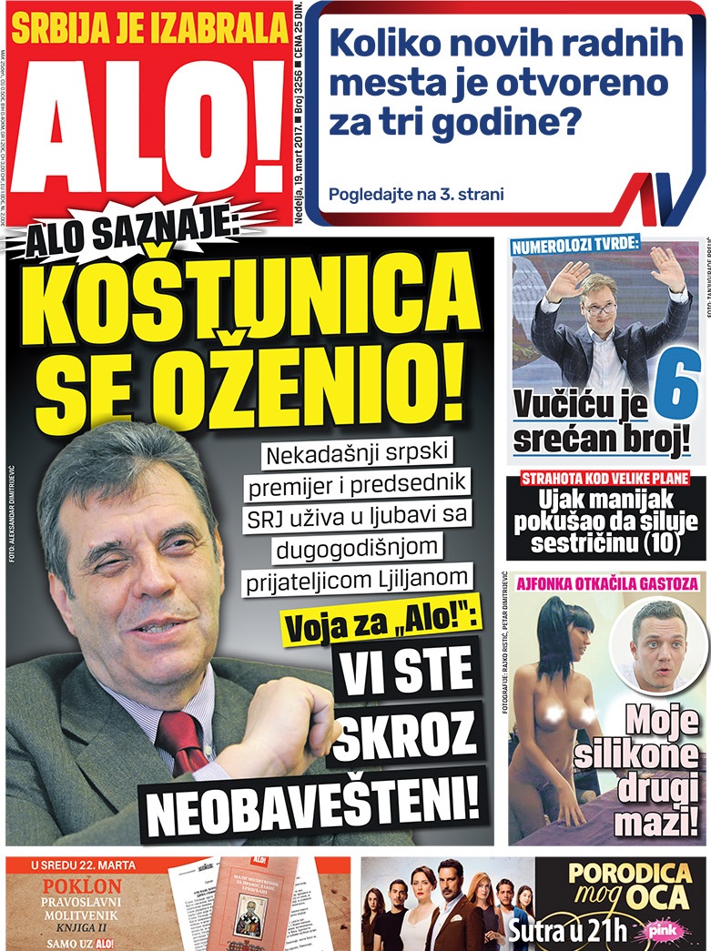Dnevnik Alo sad već otvoreno podržava Aleksandra Vučića, uz, ovaj put, dva nezaboravna naslova: jedan nakon izvlačenja rednih brojeva na biračkom listiću („Vučiću je 6 srećan broj“), a jedan nakon Vučićeve posete Novom Pazaru („Dočekan kao Tito“).