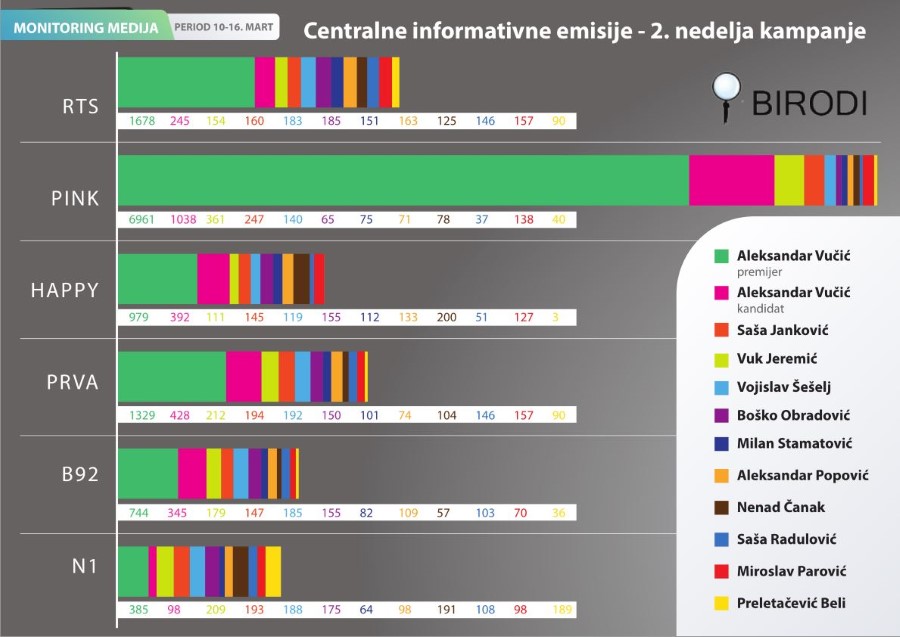 Što se tiče ostatka elektronskih medija, retki su programi koji su uopšte gledljivi. Pošto je suvišno prepričavati, recimo samo da je prema medijskom monitoringu Biroa za društvena istraživanja (BIRODI), u centralnim informativnim emisijama TV Pink od 10. do 16. marta premijerskim aktivnostima Aleksandra Vučića bila posvećena ukupno 6.961 sekunda, a njegovoj predsedničkoj kampanji 1.038 (vidi grafikon). Od ukupno 7.999 sekundi, NIJEDNA nije utrošena za negativan ili kritički osvrt na Vučićev lik i delo.