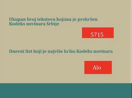 „Apsolutni šampion je kao i prethodnih godina je Alo, a tradicionalno najmanje imaju Danas i Politika. Najviše prekršaja ima o istinitosti izveštavanja, a naša pretpostavka je da je to zbog bliženja izbora, jer su najčešće prekršene tačke 1 i 2“, kaže Skrozza.
