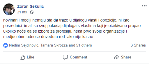 Novinari i mediji nemaju šta da traže u dijalogu vlasti i opozicije, ni kao posrednici. Imali su svoj pokušaj dijaloga s vlastima koji je očekivano propao. Ukoliko hoće da se izbore za profesiju, neka prvo svoje organizacije i međusobne odnose dovedu u red. Ako nije kasno (Zoran Sekulić)