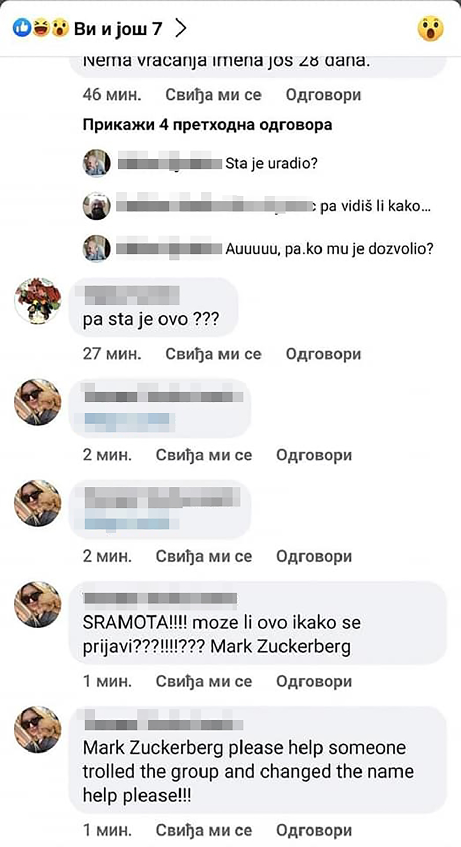 “Sramota!!! Može li ovo ikako da se promeni???!!!??? Mark Zuckerberg”, prenela je sav svoj očaj na tastaturu Tamara Tasha Jevrić, koja nije bila lenja, nego je pisala i Marku Zakerbergu, vlasniku Fejsbuka, lično.