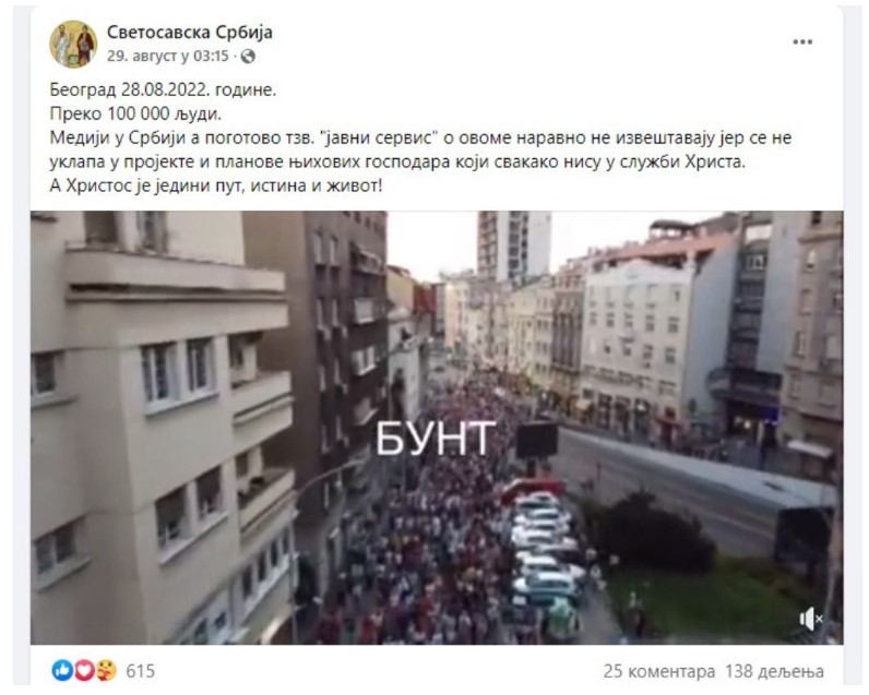 „Srbija danas, 100 000 ljudi šeta u Beogradu za očuvanje tradicionalne porodice, religije, identiteta i tradicionalnih moralnih vrednosti. Događaj je cenzurisan od strane evropskih medija.”