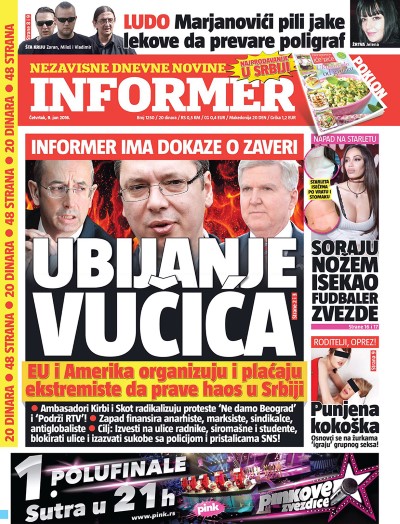Jedan od najsvežijih primera zabeležen je 9. juna 2016. kada je premijerov portret prikazan između fotografija Majkla Davenporta i američkog ambasadora Kajla Skota, uz naslov „Ubijanje Vučića“, nadnaslov „Informer ima dokaze o zaveri“ i potpuno antologijski podnaslov „EU i Amerika plaćaju ekstremiste da prave haos u Srbiji“. Već sutradan su na naslovnoj stranici objavljene fotografije tih „ekstremista“, među kojima čak i troje ljudi iz Cenzolovke (?!).