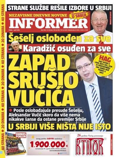 Nešto ranije, 1. aprila 2016, objavljena je naslovna strana koja se danas, post festum, čini gotovo nadrealno besmislenom. „Zapad srušio Vučića“ tvrdi uredništvo Informera, uz podnaslov „U Srbiji više ništa nije isto“ i objašnjenje „Posle oslobađajuće presude Šešelju, Aleksandar Vučić skoro da više nema nikakve šanse da ostane premijer Srbije“.