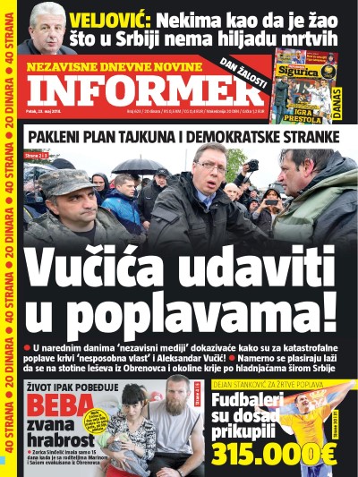 Uprkos žestokoj konkurenciji, nezaboravna je ipak naslovna strana od 23. maja 2014, kada je, uz naznaku „Pakleni plan tajkuna i Demokratske stranke“, objavljena fotografija premijera koji sa tadašnjim ministrom odbrane Bratislavom Gašićem obilazi poplavljena područja, ali i upozorenje „Vučića udaviti u poplavama!“. Da ne bi ispalo kako Informer daje recept za davljenje premijera (daleko bilo), tu je i kratko objašnjenje: „U narednim danima ‘nezavisni mediji’ dokazivaće kako su za katastrofalne poplave krivi ‘nesposobna vlast’ i Aleksandar Vučić!; Namerno se plasiraju laži da se na stotine leševa iz Obrenovca i okoline krije po hladnjačama širom Srbije“.