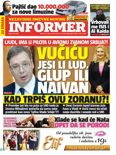 Zanimljivo je da Dragan J. Vučićević, koji gaji neskrivenu simpatiju prema premijeru, na svojim naslovnim stranama vrlo često šalje poruke koje mogu različito da se protumače: osim naslovne s omčom oko Vučićevog vrata i priče o davljenju u poplavama, tu je i izuzetno zanimljiva naslovna strana objavljena 3. juna 2015, s pitanjem „Vučiću, jesi li glup, lud ili naivan“, pa sitnijim fontom „… kad trpiš ovu Zoranu?!“