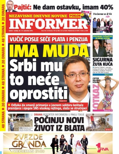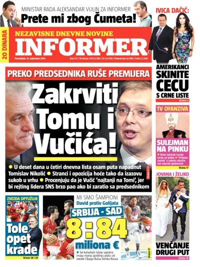 Konačno, u svetlu ovonedeljnih događaja, u ovaj izbor trebalo bi svakako uvrstiti naslovnu stranu Informera koja je u vreme kada je objavljena (15. septembra 2014) delovala potpuno neverovatno. Tu se, naime, kaže da „stranci i opozicija“ hoće da izazovu sukob u vrhu SNS-a i da „preko predsednika ruše premijera“. Tvrdi se da oni „procenjuju da je ‘Vučić najtanji na Tomi’, jer bi rejting lidera SNS brzo pao ako bi zaratio s predsednikom“.