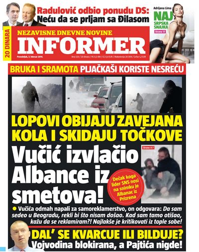 Uz obaveštenje kako „lopovi obijaju zavejana kola i skidaju točkove“ i odgovor Vučića na optužbe za samoreklamerstvo, tu je objavljen naslov koji nema nikakve veze ni s ostatkom sadržaja, ni s profesionalnim standardima: „Vučić izvlačio Albance iz smetova!“ piše uz snimke Vučića koji nosi dete u naručju i kolone zavejanih automobila. Na stranu to što nadnaslov i podnaslov pričaju jednu, a sam naslov sasvim drugu priču – to je za Informer ne tako atipična pojava.