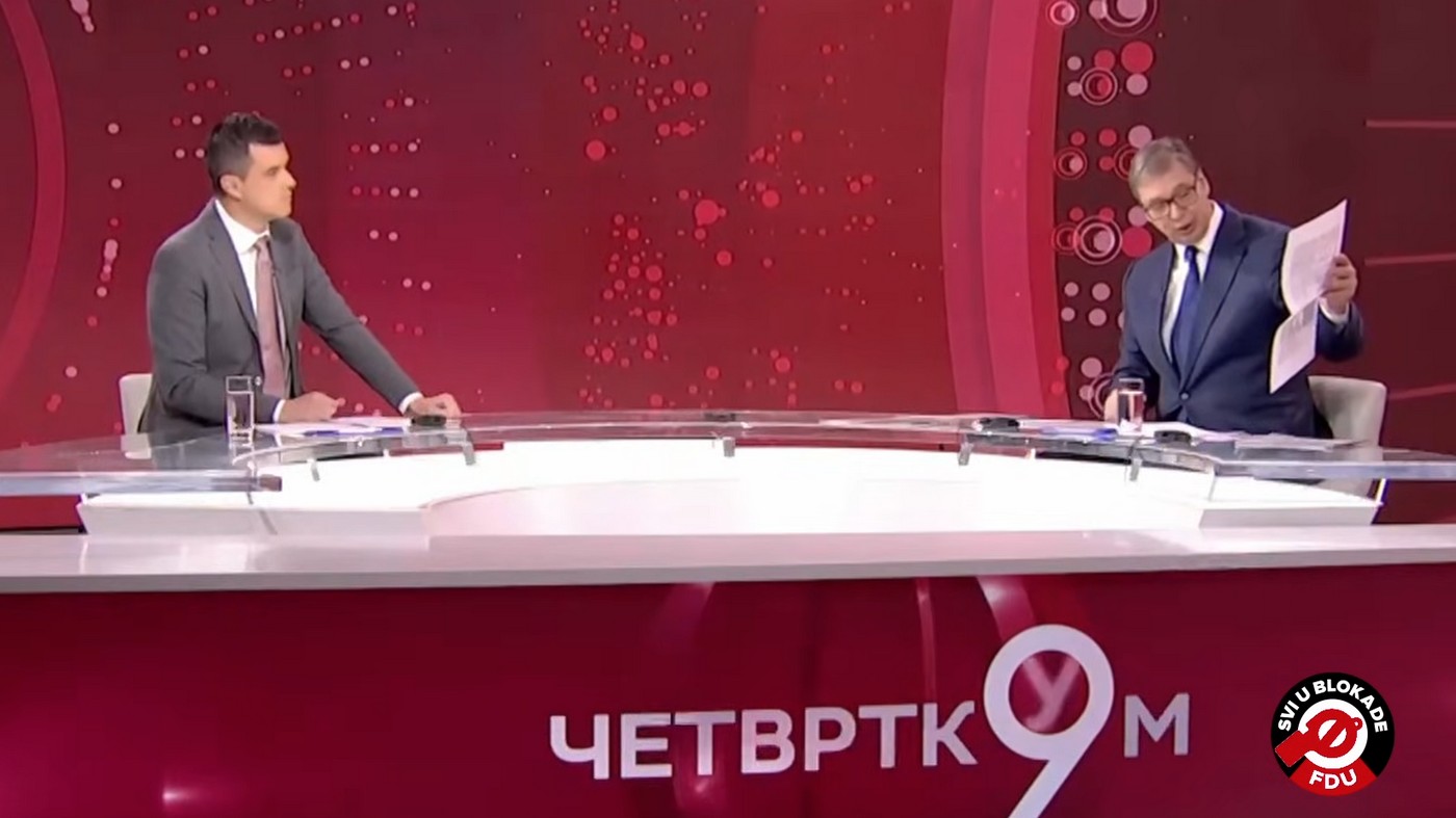U filmu studenata Fakulteta dramskih umetnosti prikazana su gostovanja predsednika Vučića na javnom servisu, gde se vidi kako „vodi dijalog“ sa novinarima RTS-a, odnosno kako ih prekida dok govore i pokušavaju da mu postave pitanje.
