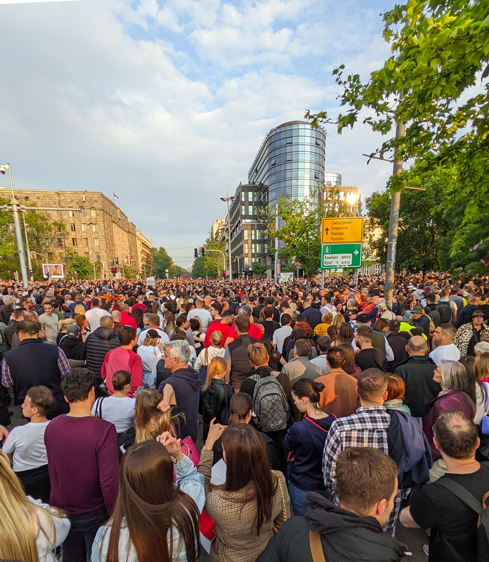 Glavna tema subotnjeg broja Blica na naslovnoj strani je novi sistem „Čuvam te“, a na Novostima tekst o Kosovu pod naslovom „Kurtijeva okupacija na severu“. Novosti su, doduše, izvestile o skupu SNS u Pančevu na kojem je govorio predsednik Aleksandar Vučić, a koji se održavao u isto vreme kada i treći protest „Srbija protiv nasilja“ u Beogradu.