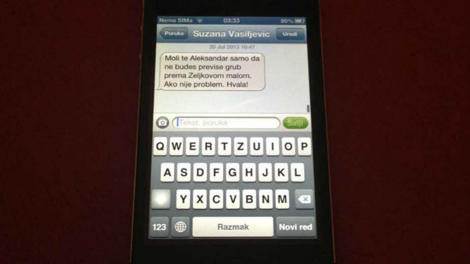 „Moli te Aleksandar samo da ne budeš previše grub prema Željkovom malom. Ako nije problem. Hvala“ – ukoliko sledeće vlasti budu lustrirale zbog očiglednog pritiska na medije iz kabineta predsednika Vlade Srbije, ovaj Vaš SMS (na slici) će biti sasvim dovoljan dokaz.
