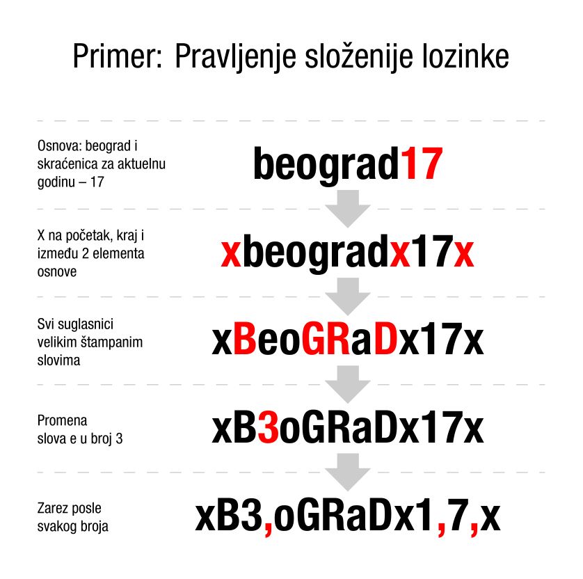 Postavlja se pitanje kako zapamtiti tako složene šifre i još ih redovno menjati. To zapravo uopšte nije komplikovano, važno je samo da se napravi sistem – svako za sebe i onako kako mu je najlakše. U konkretnom slučaju „xB3,oGRaDx1,7,x“ sistem je bio takav da je osnova lozinke napravljena od reči beograd i skraćenice za aktuelnu godinu – 17 (ovo inače nije preporučljivo, ali sada samo dajemo primer). Pored osnove, važno je da postoji i određeni set pravila, u ovom slučaju su bila četiri, kako se i vidi na grafici.