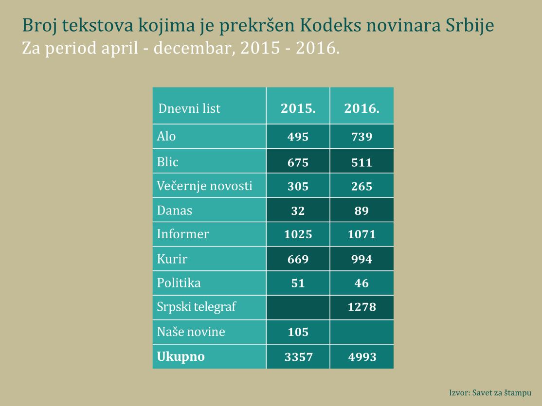 Savet za štampu je od aprila do decembra 2016. godine, analizirajući osam najvažnijih dnevnih listova zabeležio 4.993 teksta u kojima je prekršena bar jedna tačka Kodeksa, što je drastičan skok od 49 procenata u odnosu na isti period 2015. godine (uz ogradu da su u međuvremenu ugašene Naše novine, a umesto njih počeo da izlazi Srpski telegraf), kada je zabeleženo 3.357 medijskih sadržaja sa prekršajem Kodeksa.