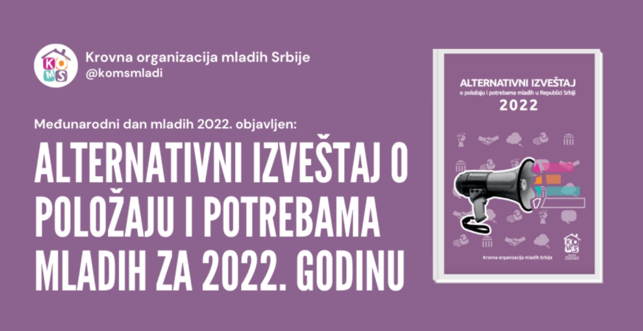 Krovna organizacija mladih Srbije (KOMS) objavila je šesti Alternativni izveštaj o položaju i potrebama mladih u Srbiji za 2022. godinu, koji je predstavila danas, na Međunarodni dan mladih. KOMS je kroz poglavlje „Mediji, društvene mreže i aplikacije” izneo stavove mladih prema medijima, društvenim mrežama i aplikacijama koje koriste.