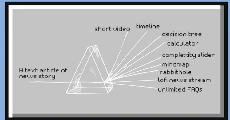 Pretplatnici takođe mogu da dobiju grafikone, „mape uma“ koje ilustruju povezanost svih elemenata u budžetu i korisnika istog, ili da zarone dublje u temu uz verziju vesti koja u svakom pasusu sadrži dodatne linkove ka daljim informacijama. Neki čitaoci će pak izabrati da vest čitaju u formi pitanja i odgovora (FAQ) jer im je tako zanimljivije i lakše.