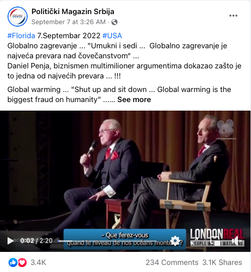 Govor američkog biznismena Danijela Penje, o tome kako je globalno zagrevanje najveća prevara ikada, jedan je od najpregledanijih sadržaja na Fejsbuku u Srbiji u poslednjih nekoliko dana.