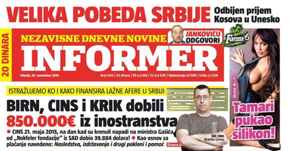 Njihov najneprijatniji zadatak, međutim, su besprizorni, klevetnički napadi na svakoga ko zasmeta stranci na vlasti. Istraživački novinari su među njihovim redovnim žrtvama. O CINS-u je do sada Informer objavio toliko laži da je to neverovatno, a daleko od toga da smo među njihovim omiljenim metama. Omeli smo, na primer, premijerov dvodnevni odmor namerom da prisluškujemo njegovu spavaću sobu, redovno se sastajali sa Šefom delegacije EU kako bi srušili Aleksandra Vučića sa vlasti, učestvovali u zajedničkom zločinačkom poduhvatu, strani smo plaćenici, špijuni… Ta vrsta pritiska je naizgled samo kaljanje našeg ugleda kod onih koji zapravo i ne znaju šta i kako radimo, ali je u isto vreme i krajnje opasna zbog stvaranja atmosfere da je nas zapravo vrlo korisno ukloniti na bilo koji način.