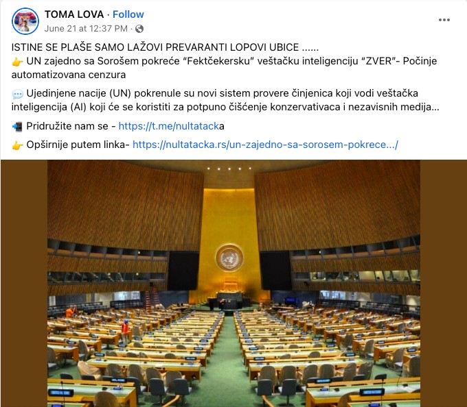 Portal „Nulta tačka” objavio je članak u kojem se tvrdi da su Ujedinjene nacije i američki milijarder Džordž Soros pokrenuli „fektčekersku veštačku inteligenciju ‘Zver’”, posredstvom koje će se, kako se navodi u članku, „sprovoditi automatizovana cenzura”.