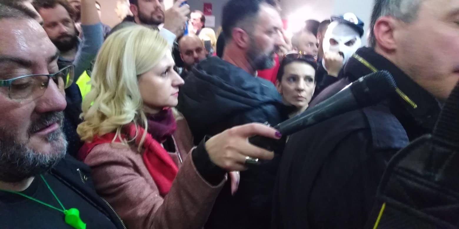 Sad je oko mene više policije nego demonstranata. Ali sa sprata silaze neki drugi policajci, ne oni koji su sve vreme imali obzira prema meni kao novinarki i ženi sa 55 kilograma. Na snimku telefonom jasno se vidi momenat kada me sabijaju uza zid i ja izgovaram: Aaa… Napeto, opet je veoma napeto. Ja nemam kud, sabijena sam u ćošak, i dalje snimam.
