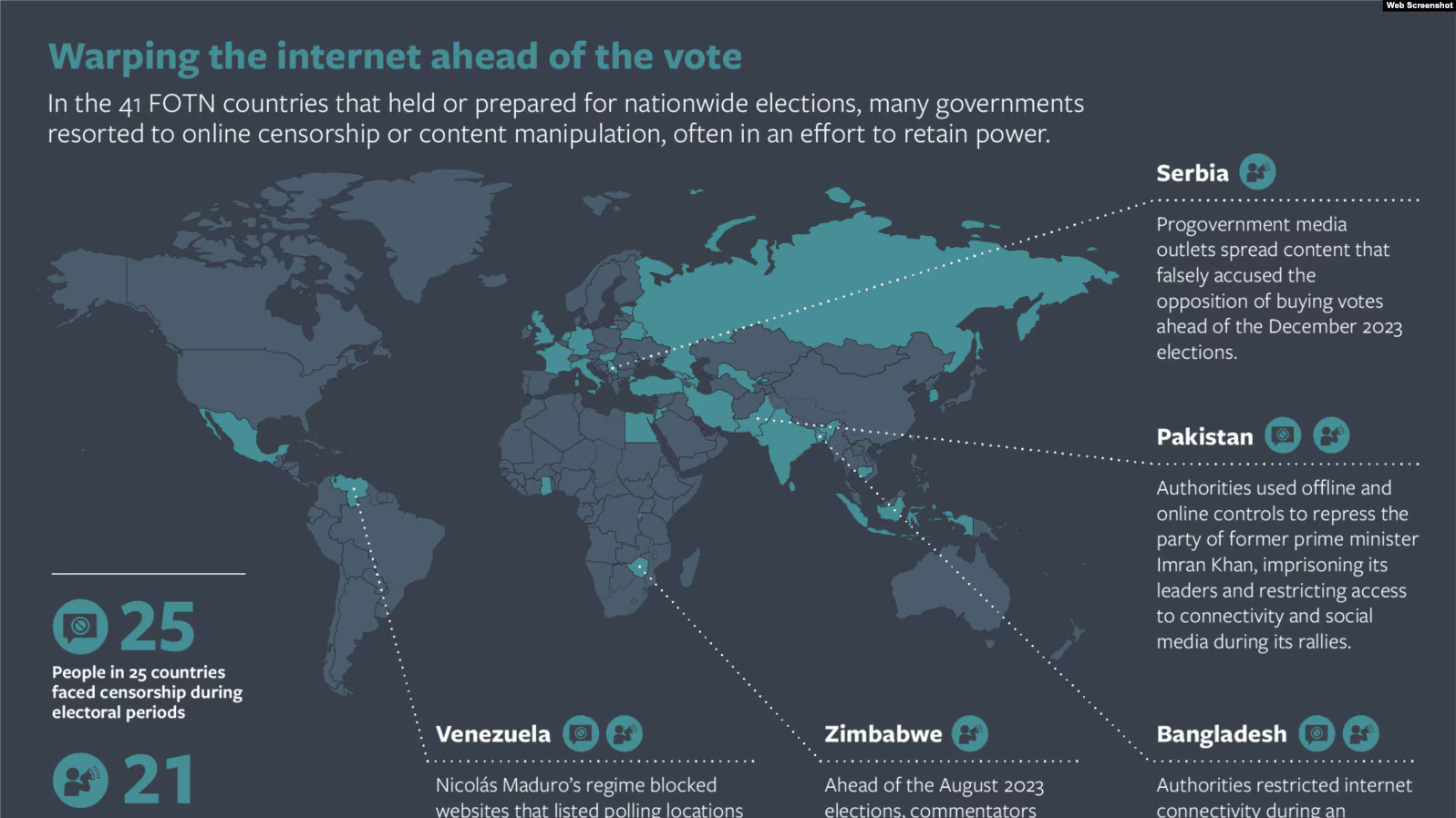 Od osam pretnji po slobodu na internetu koje prati ova organizacija sa sedištem u Vašingtonu, u Srbiji su zabeležene dve, i to prvo u kategoriji u kojima provladini učesnici rasprava na internetu manipulišu narativ. Navodi se da provladini mediji šire sadržaje koji su lažno optuživali opoziciju da je kupovala glasove uoči izbora u 2023. godini.