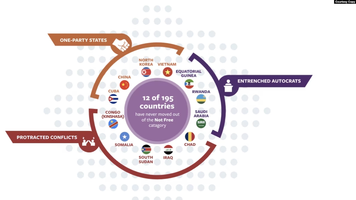 Sve više zemalja nalazi se u kategoriji delimično slobodnih, umesto da se kreću ka punoj demokratizaciji. Ipak, svet je danas mnogo slobodniji nego pre 50 godina. Slobodnih zemalja je 1973. godine bilo 44 od 148, sada taj status ima 84 od 195 zemalja. Broj zemalja u kojima opada demokratija, 35, do sada je najmanji od kada je trend počeo. Poboljšanja ima u 34 zemlje.