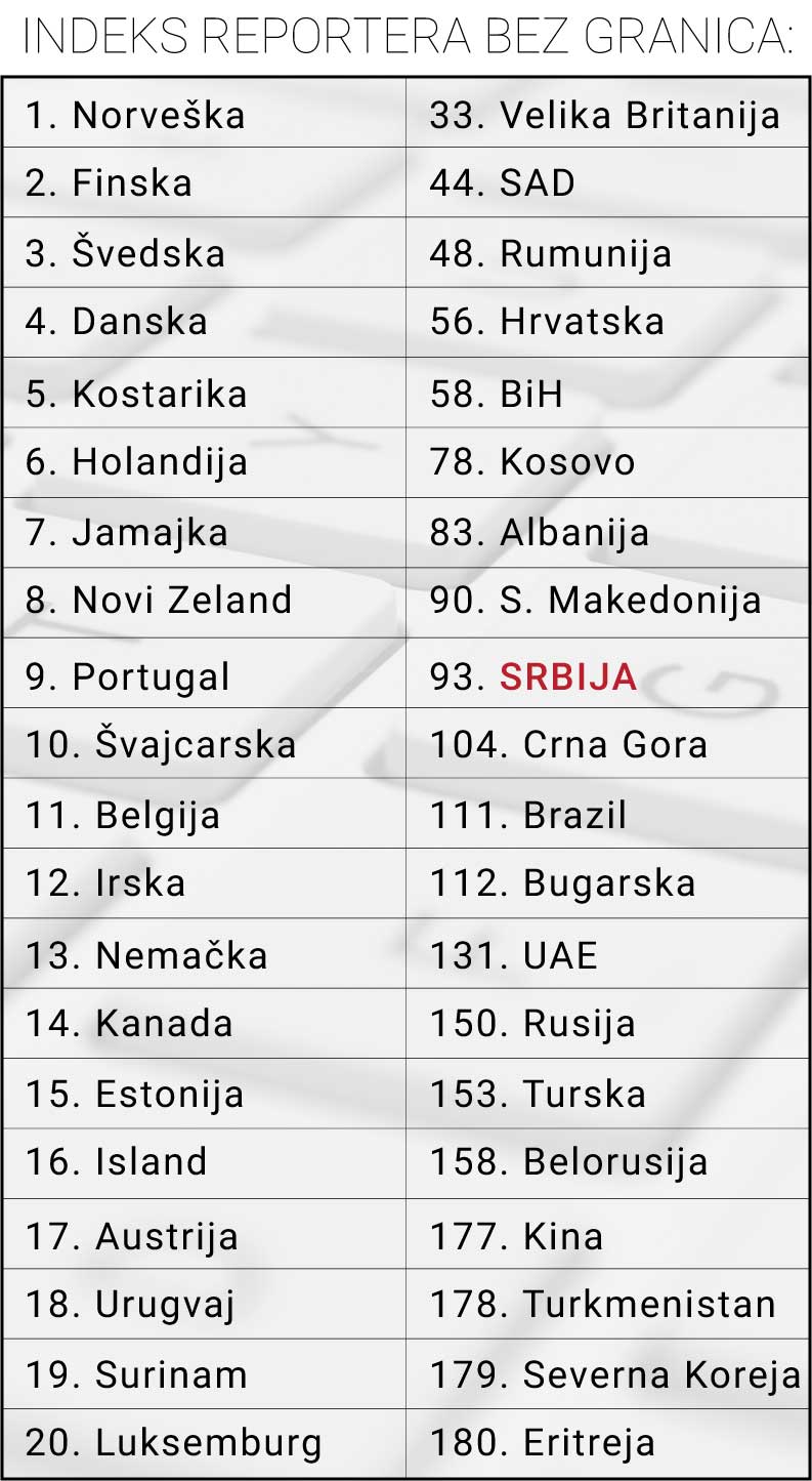 Globalni Indeks slobode medija 2021, koji je jutros objavila međunarodna organizacija za slobodu novinara i medija Reporteri bez granica, pokazuje da je Srbija ostala loše rangirana, u donjoj polovini tabele, na nezavidnom 93. mestu, sa kog se nije pomerila od prethodne godine.
