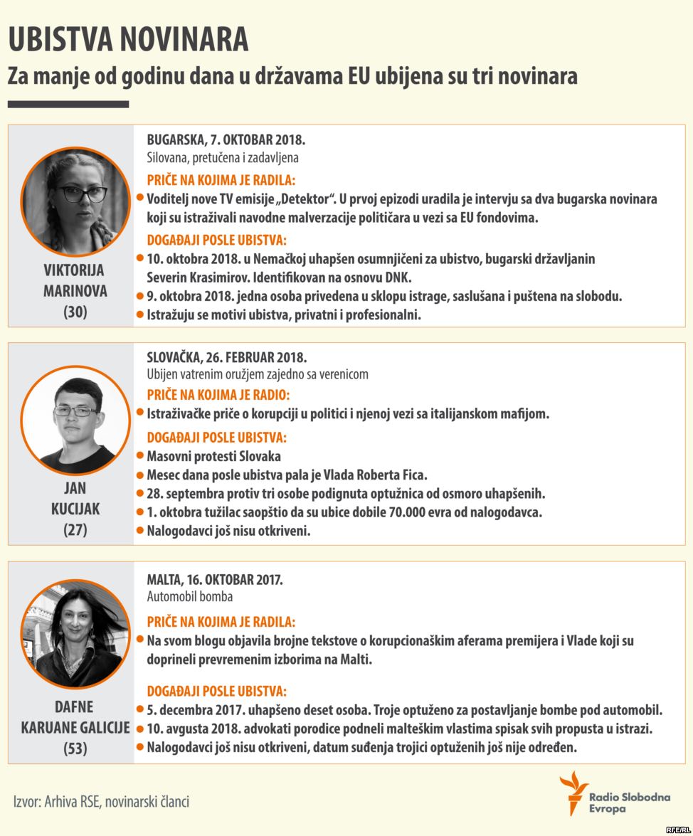 Ubistvo bugarske novinarke Viktorije Marinove treće je ubistvo novinara u EU u poslednjih godinu dana. Početkom godine ubijen je slovački novinar Jan Kucijak a u oktobru prošle godine istraživačka novinarka sa Malte Dafne Karuane Galicije. U sva tri slučaja zvaničnici Evropske unije oštro su osudili zločine, tražeći hitnu rešavanje slučajeva. Šta je i koliko urađeno do sada i na kojim temama su radili ubijeni novinari?