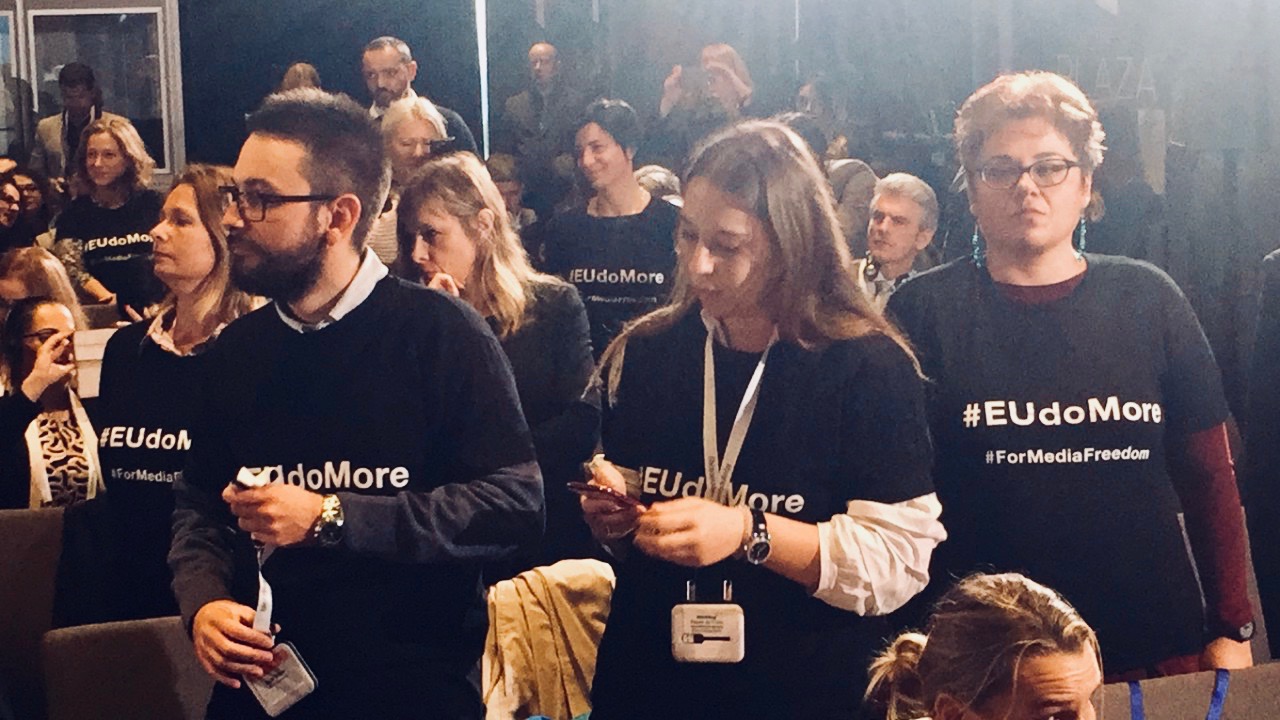 Nakon niza uličnih akcija, Grupa za slobodu medija imala je i prvi „međunarodni nastup“, i to na konferenciji „Medijski dani Zapadnog Balkana“ održanoj u Tirani 9. i 10. novembra pod pokroviteljstvom evropskog komesara Johanesa Hana. Predstavnici Grupe, koji su tamo pozvani lično, bili su odeveni u crne majice na kojima je pisalo „EU do more“ („Evropo, učini više“) i na svim panelima opisivali stanje medijskih sloboda i objašnjavali njihovu pozadinu. Po oceni mnogih, Grupa je uspela da preusmeri tok čitave konferencije.