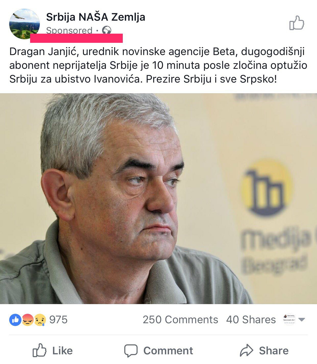 Poziv na linč Dragana Janjića, glavnog urednika novinske agencije Beta i potpredsednika Nezavisnog udruženja novinara Srbije, nakon ubistva Olivera Ivanovića u Kosovskoj Mitrovici, ne samo da se pojavio na Fejsbuku nego je i plaćen kao oglas na ovoj društvenoj mreži.