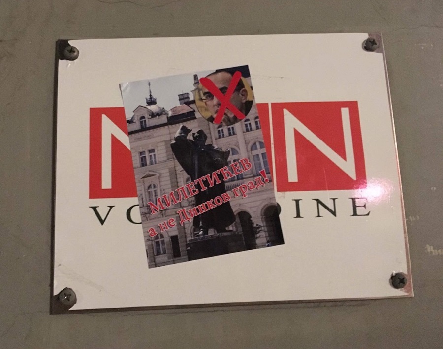„Tabla je, kao što se vidi na fotografiji koju prilažemo, iškrabana do neprepoznatljivosti, a dva dana ranije je na njoj osvanula i nalepnica na kojoj je prekriženo lice programskog urednika NDNV-a Dinka Gruhonjića uz tekst ‘Miletićev a ne Dinkov grad’, kaže se u saopštenju NDNV.
