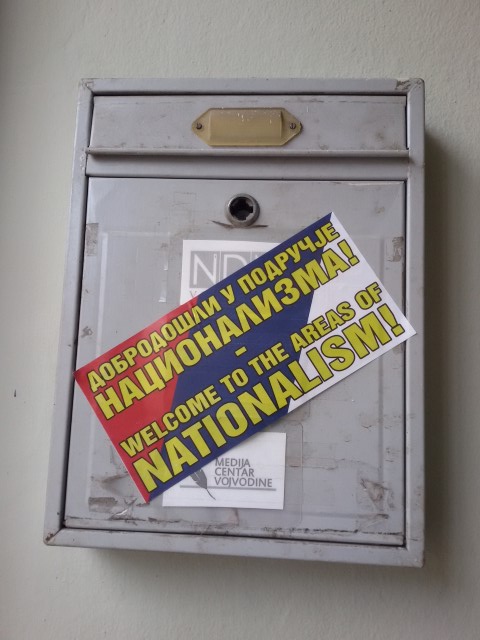 Tabla i poštansko sanduče su, kao što se vidi na fotografijama koje prilažemo, prelepljeni parolama na srpskom i na engleskom jeziku: Dobrodošli u područje nacionalizma!