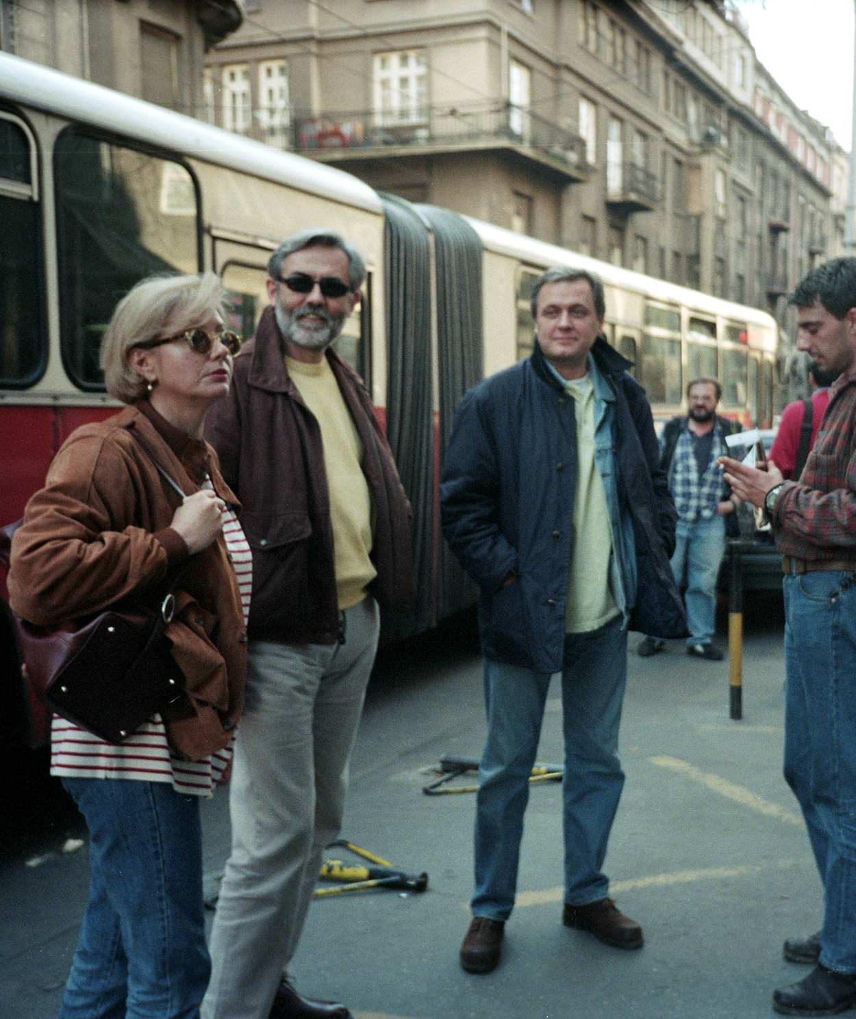Slavko Ćuruvija i Branka Prpa isped Ateljea 212 za vreme vazdušne uzbune, mart 1999. (ovo su poslednje fotografije Slavka Ćuruvije pred surovu likvidaciju 11. aprila 1999. godine). Foto: Goranka Matić