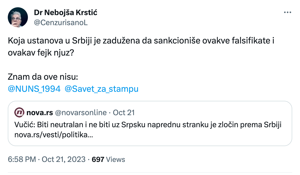 Kao što je moguće čuti, predsednik Srbije zaista je izgovorio rečenicu zbog koje je Krstić optužio Novu za „falsifikat i fejk njuz“.