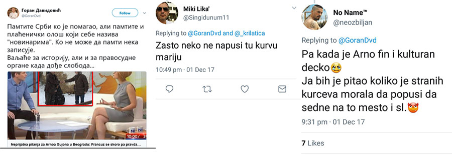 „Jebem li ti mater kučko prodana. Ko si ti da Arnoa prozivaš, čovjeka koji je toliko ljudi pomogao! Jebem li vam mater svima redom u tom govnetu od televizije, zapaliti vas treba do temelja“, poruka je koju je novinarka N1 Marija Antić dobila preko Tvitera. „Zašto, droljo? Zbog novca?.. Želim ti da sav novac koji ovako zarađuješ potrošiš na lečenje svoje dece“, poručio joj je drugi besni građanin.