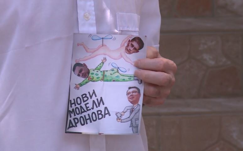 „Došao sam ispred Robne kuće Beograd gde je bilo nekih stotinak ljudi. Poneo sam srpsku zastavu, jer sam patriota. Nosio sam je na štapu. Kad je počeo da govori ministar policije Nebojša Stefanović, zastavu sam ostavio i uzeo sam karikaturu, koja je bila sklopljena. Otvorio sam je i stavio na štap“, kaže umetnik i nastavnik u penziji Slavoljub Blagojević.