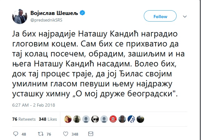 U priču se uključio i predsednik Republike Aleksadnar Vučić, između ostalog rekavši da u Srbiji koju vodi „niko nikoga neće vrteti na ražnju“. Začudo, slične izjave ili reakcije policije nije bilo kada je njegov mentor/bivši šef/politički otac na najavu mogućnosti da Nataša Kandić dobije Nobelovu nagradu zimus javno pominjao nabijanje na kolac koje bi on izvršio lično. Naravno da nije uhapšen. Isto kao što ne privode jednog od lidera Levijatana koji svakodnevno najprizemnijim psovkama i rečnikom časti svakog ko mu se ne sviđa ili kritikuje rad te fondacije. Koji majkama i sestrama kritičara preti seksualnim i fizičkim nasiljem.